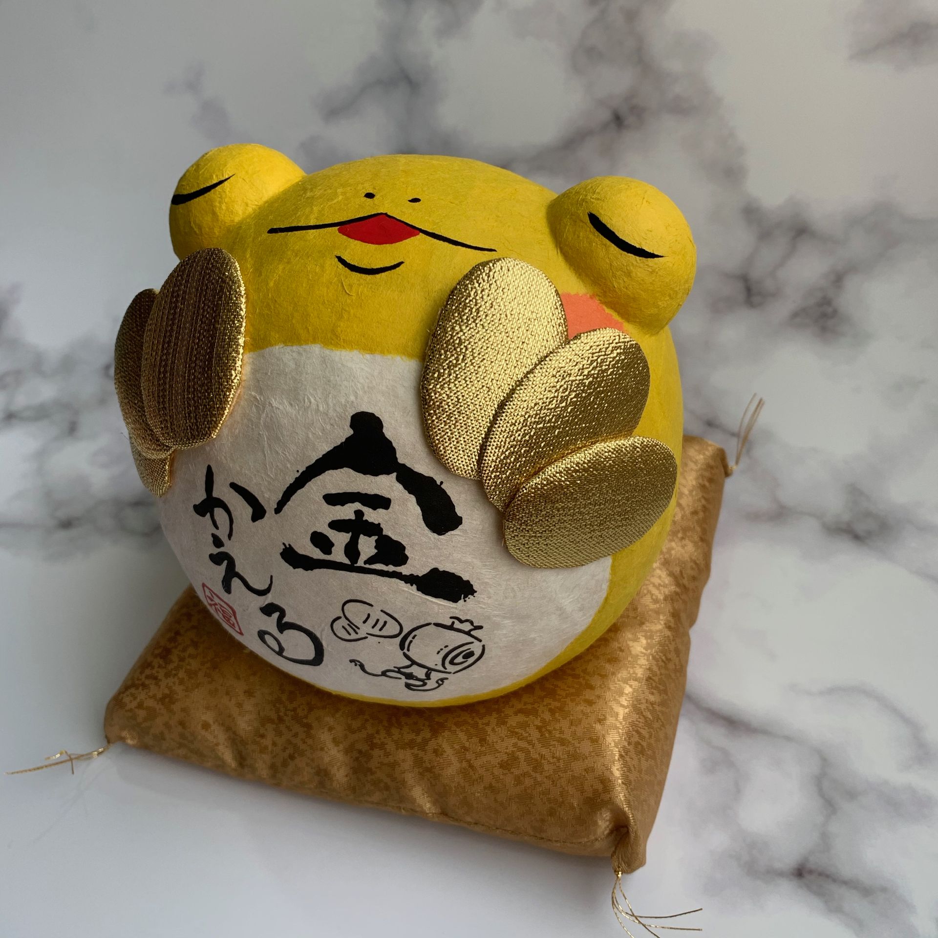吉祥物青蛙較不為大眾所知,青蛙在日本之所以代表好兆頭,是因為青蛙的日文かえる/カエル(kaeru)音同日文的「回來/返回」,象徵能帶來好運,包括「幸福回來」、 「招財(錢財回來)」、 「青春回來」、「好運來」、「平安回家」等喻意。