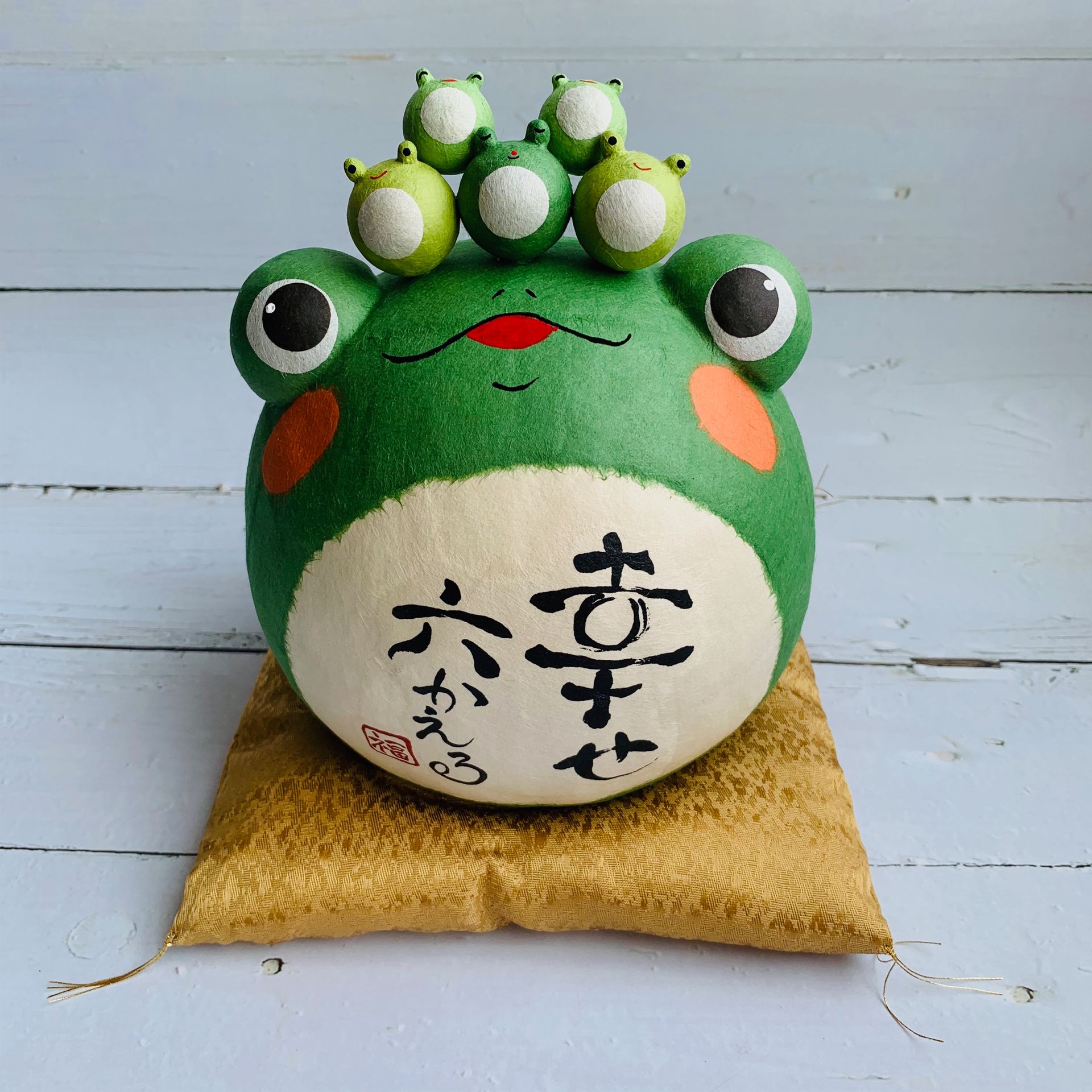 若有「6隻青蛙」,日文音近「迎接(mukaeru)」,日本的手工藝品會搭配日文「幸せ」,喻意則為「迎接幸福」。日本人會將相關的贈品送給親朋好友,表達祝賀,希望他們能「迎接幸福」 。